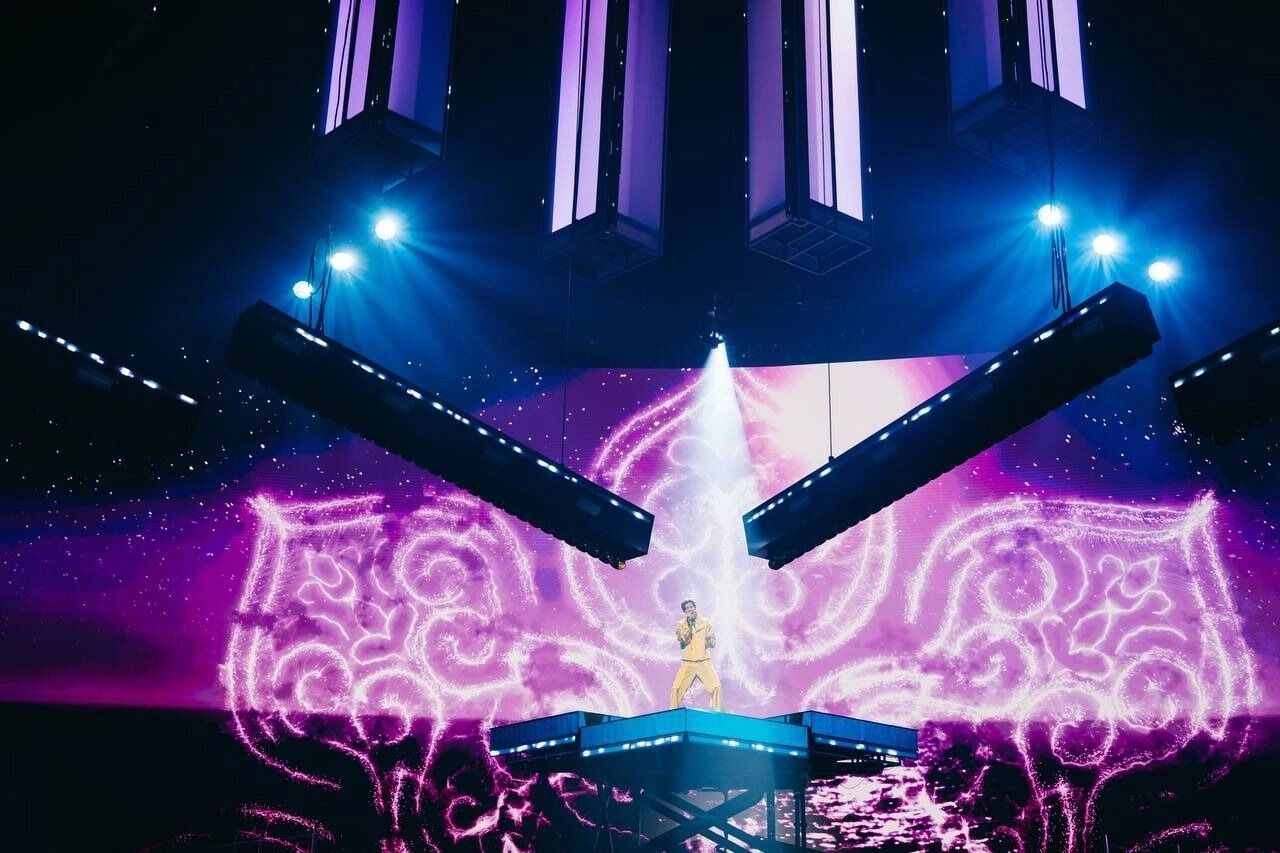 Сценическая композиция строилась вокруг традиционных символов культуры Вьетнама. Образ зеленого бамбука эффектно был отображен не только в виде футажей, и подчеркнут сотней pixel bar, светодиодными трубками и светящимися кубами, которые так же меняли расположение и высоту. Изменение высоты и расположения светодиодных поверхностей вкупе с ярким контентом и сменой костюмов исполнителя позволило добиться достаточно яркой динамики и более насыщенной сценографии.